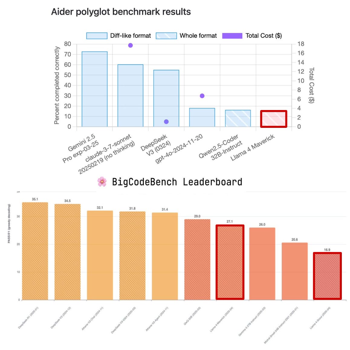 In questa immagine vediamo i risultati di diversi modelli di punta su due benchmark indipendenti, Aider polyglot benchmark e BigCodeBench Leaderboard, focalizzati sulle capacità dei modelli linguistici nei task di programmazione, evidenziando le prestazioni piuttosto deludenti di Llama 4 Maverick rispetto ai suoi concorrenti.