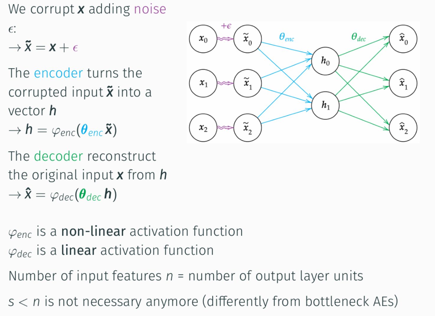 Questo input corrotto viene poi dato in pasto all’encoder. L’encoder presentato dalla funzione ɸenc con parametri θenc trasforma x̃ in una rappresentazione latente compressa h.