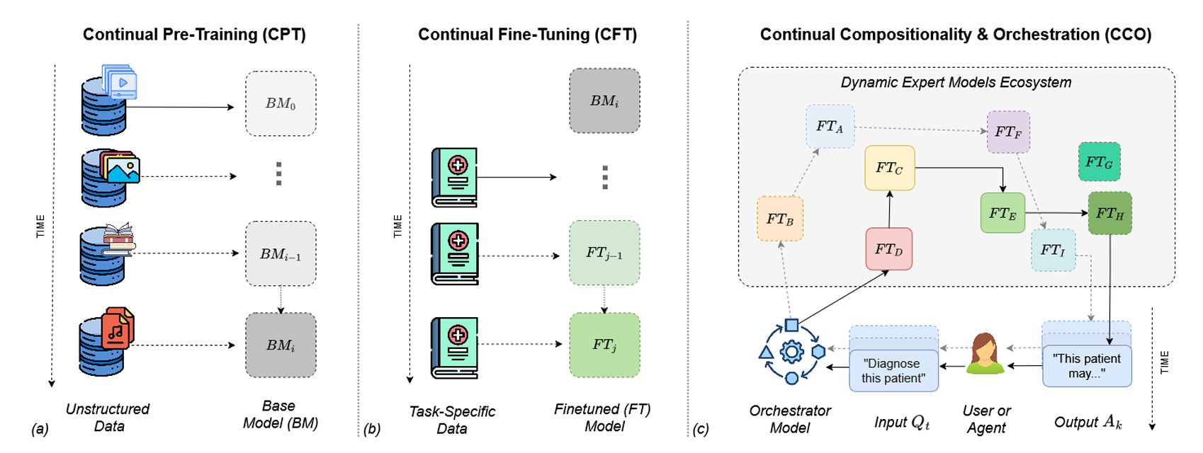 La sezione (b), al centro, invece rappresenta il Continual Fine Tuning, dove modelli pre-addestrati, costruiti anche nello step precedente, vengono specializzati, raffinati su un insieme di dati specifici di dominio, ad esempio l’ambito medico, per generare versioni continuamente ottimizzate, FTj senza dover riaggiustare completamente il modello di partenza.
