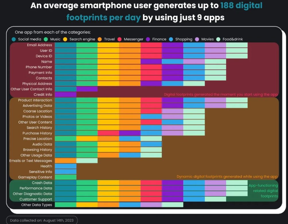 Secondo quest’analisi, bastano appena nove applicazioni diverse tra social media, musica, motori di ricerca, viaggi, messaggistica, finanza, shopping, film e cibo per produrre fino a 188 tracce digitali al giorno.