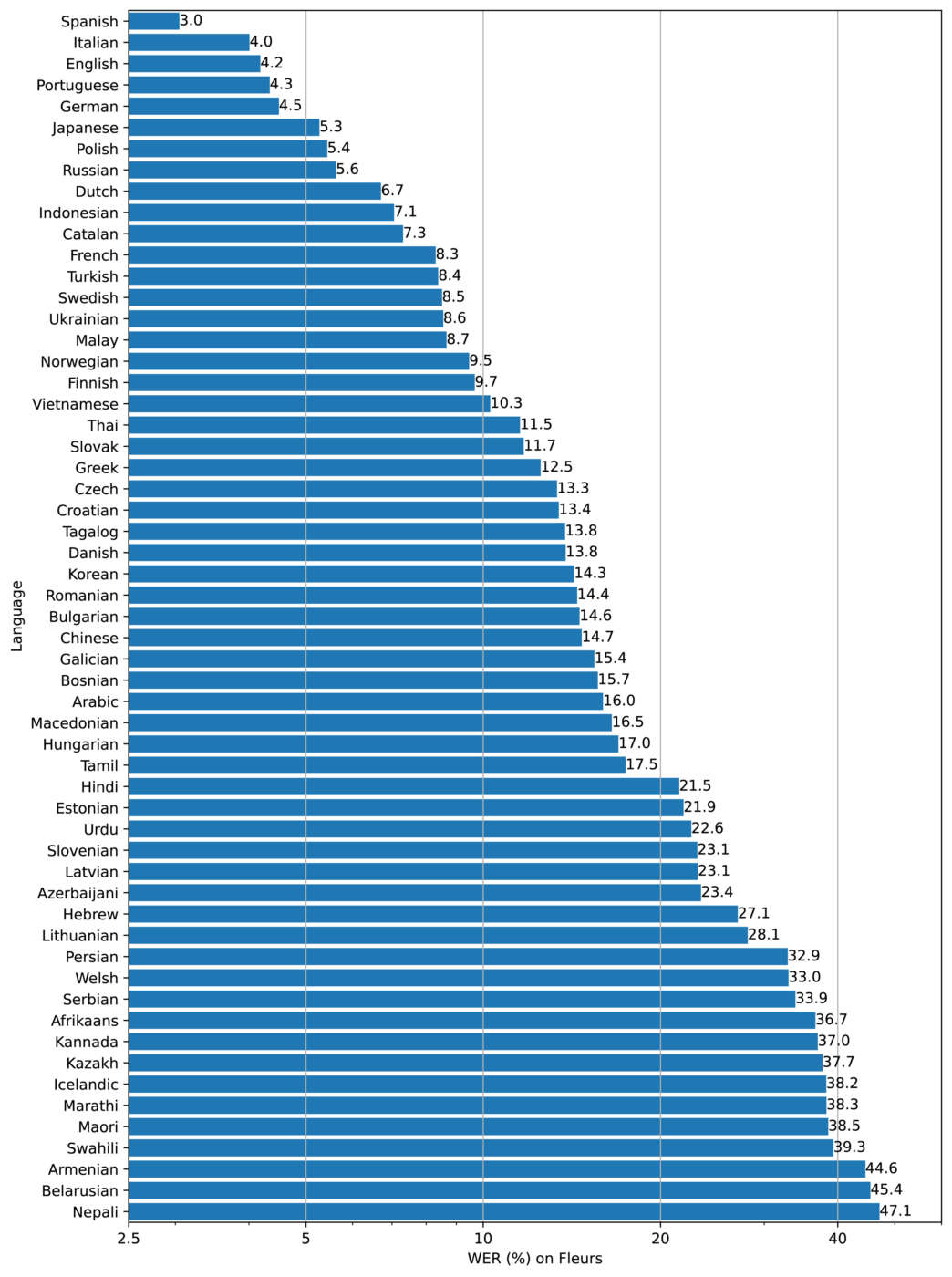 Le prestazioni di Whisper variano notevolmente a seconda della lingua. La figura mostra la ripartizione del WER (Word Error Rate) per lingua del set di dati Fleurs utilizzando il modello large-v2. Incredibilmente le prestazioni per l’italiano sono seconde soltanto a quelle per lo spagnolo, e migliori di quelle per l’inglese.