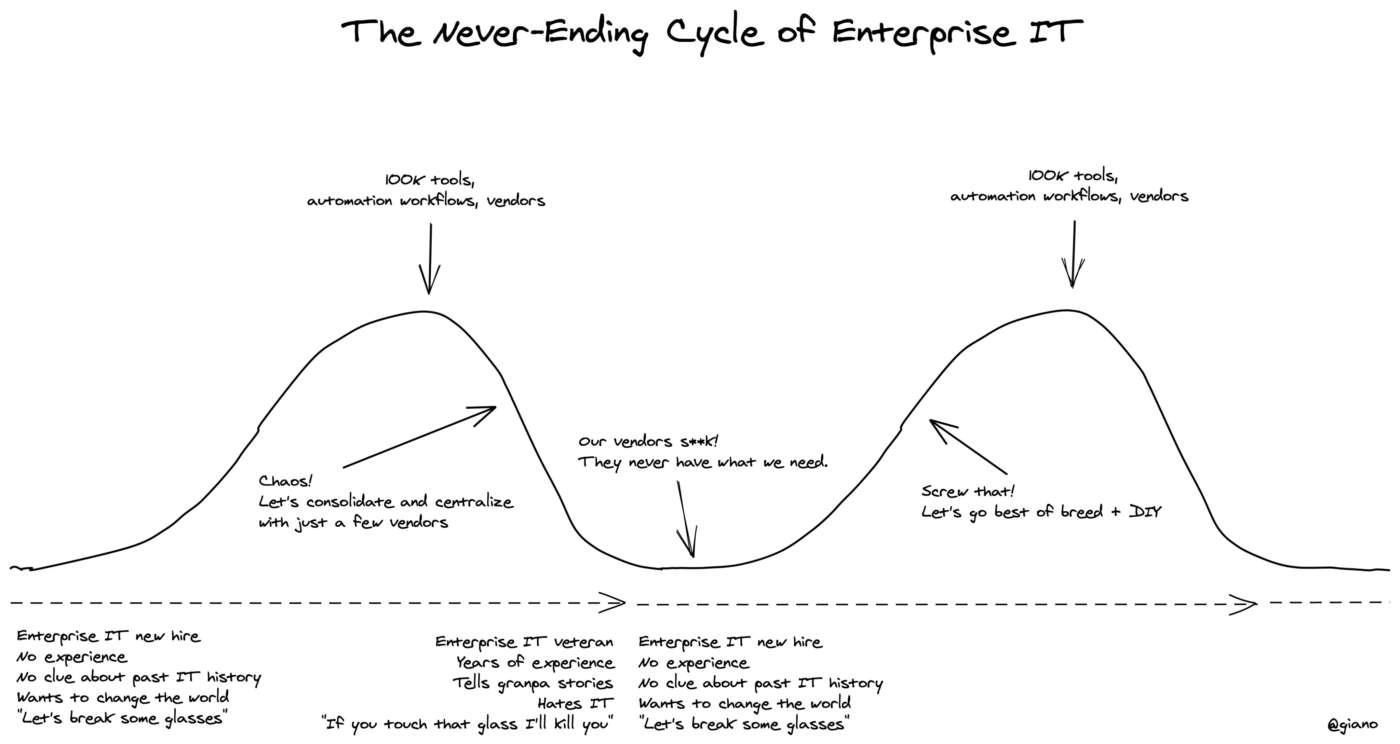 Infatti, mentre la maggior parte delle persone ha suggerito lo sviluppo di una competenza interna avanzata per altre tecnologie emergenti, io ho sempre suggerito esattamente il contrario. Per quasi due decenni, incluso il periodo in cui ho lavorato come direttore di ricerca presso Gartner, ho consigliato alle aziende più grandi del mondo di concentrarsi sul proprio core business piuttosto che distrarsi nel cercare di sviluppare competenze su questa o quella tecnologia emergente.