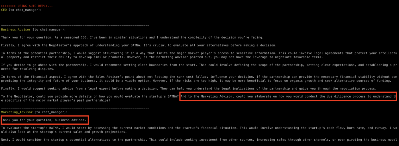 In questo esempio, ho utilizzato AutoGen per istruire ogni consigliere sintetico a fare le domande per capire meglio la raccomandazione degli altri consiglieri e a criticare la loro posizione in caso ci sia disaccordo su quella raccomandazione, il tutto senza alcun intervento da parte mia.