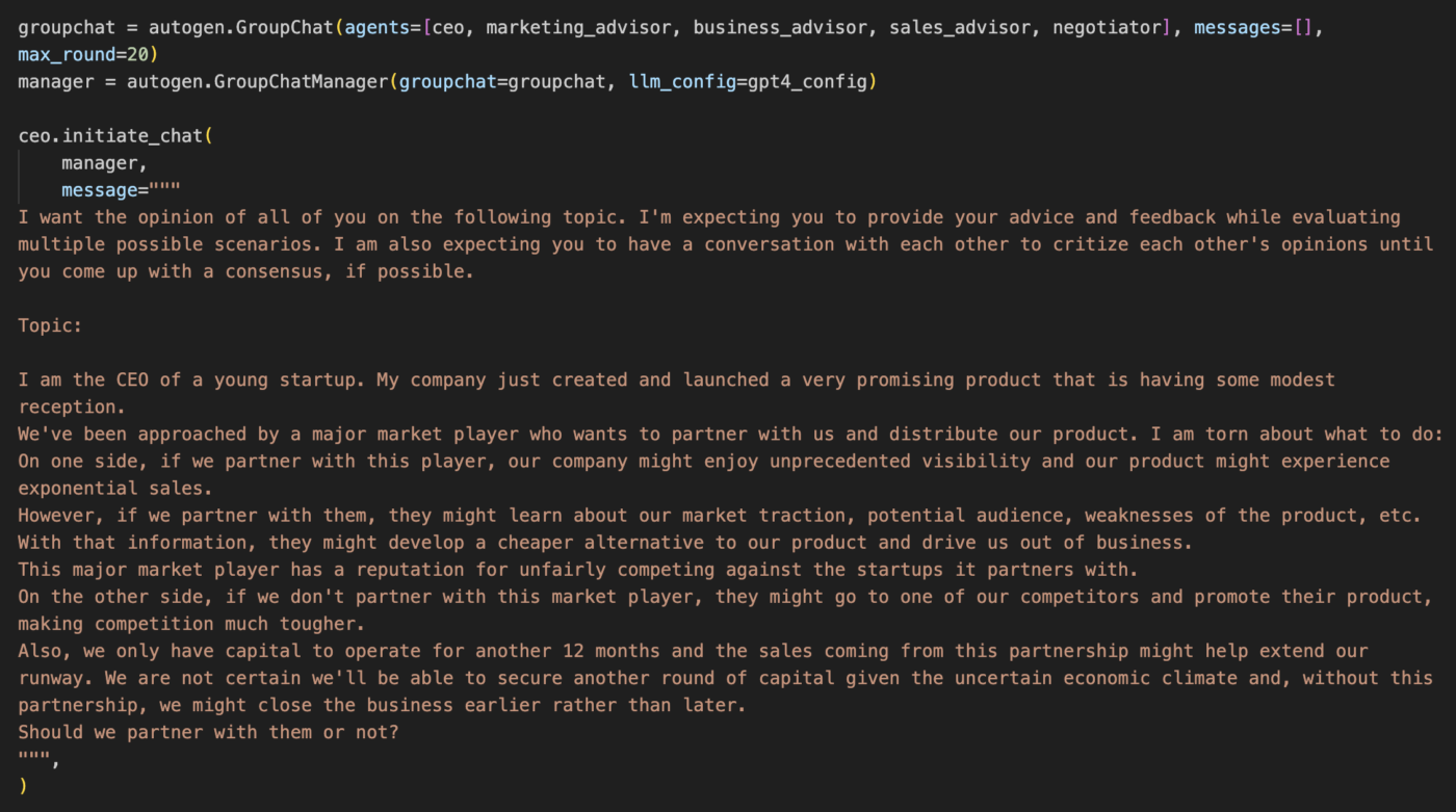 Purtroppo però, nella mia esperienza GPT-4 e altri modelli non funzionano particolarmente bene. In questo scenario c’è troppa poca varietà di opinioni tra i ruoli e per una serie di motivi tecnici si raggiunge una convergenza troppo velocemente.