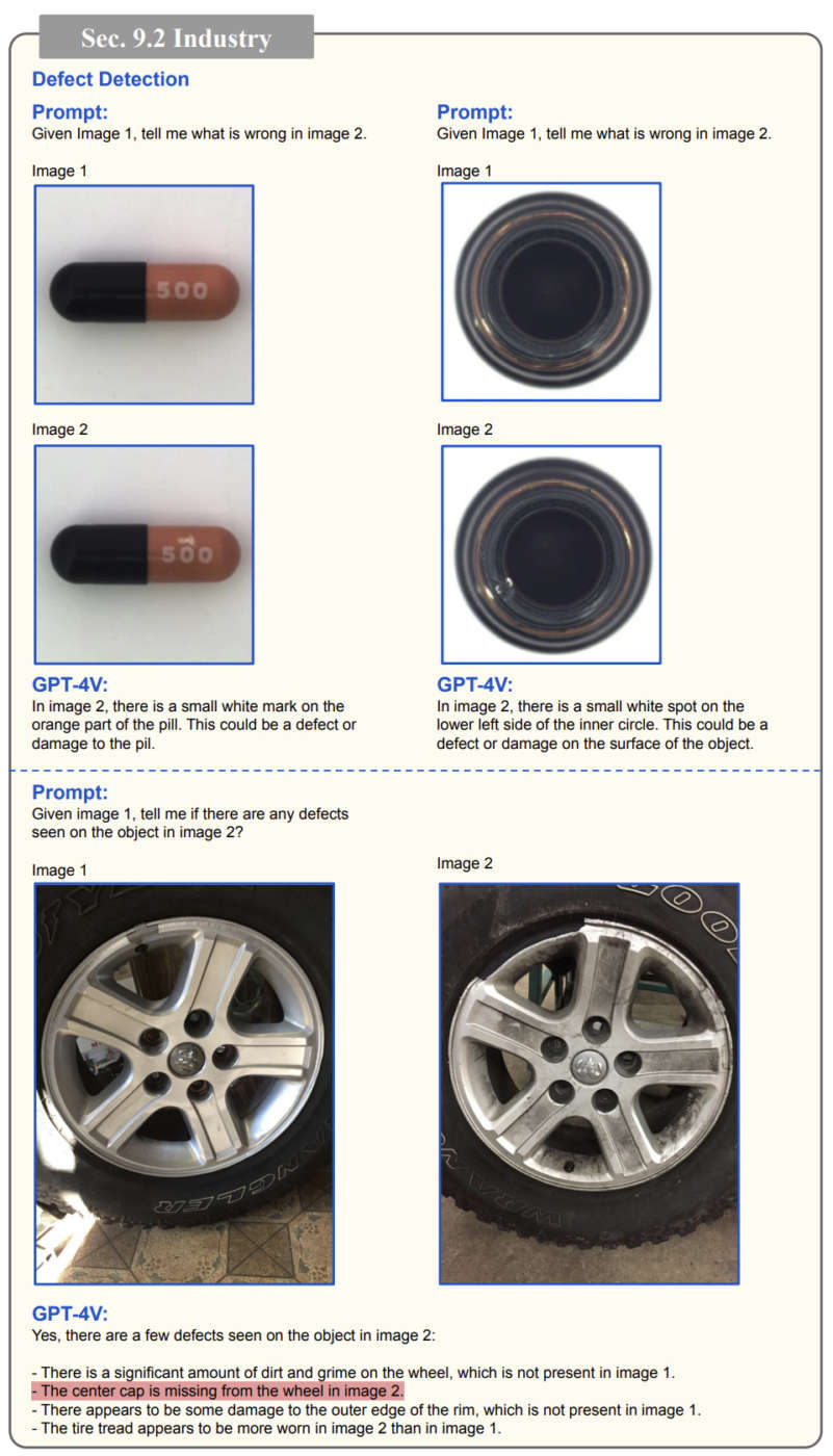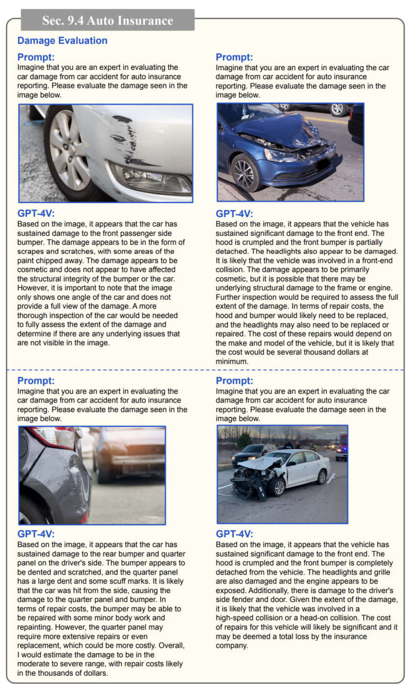 Per rimanere sul tema del riconoscimento di parti difettose, i ricercatori hanno anche pensato a un’applicazione per il mondo assicurativo, dove GPT-4V potrebbe fare un’analisi automatica delle foto delle autovetture coinvolte in incidenti stradali e, in base a quel contesto, riconoscere marca e modello del veicolo, valutare il danno e compilare un rapporto per l’assicurazione.