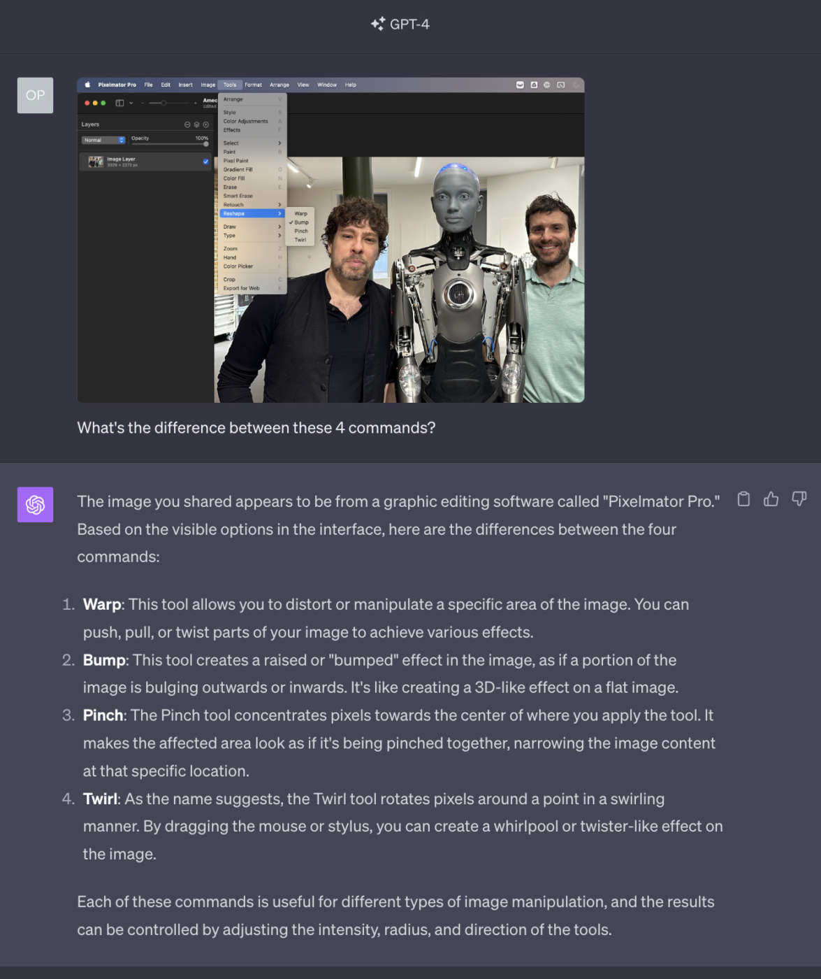 Quindi che faccio? Certo, potrei descrivere il mio problema in un prompt per GPT-4, dettagliando il contesto di Pixelmator Pro. Ma è una cosa lunga da fare. Che succede se invece faccio uno screenshot di questa situazione e lo passo a GPT-4 come contesto? l’AI capisce esattamente di cosa sto parlando e mi ricorda cosa fanno i quattro comandi che mi interessano, permettendomi di andare avanti.