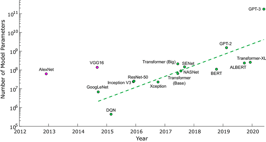Allo stesso tempo è utile notare come nel corso della storia del machine learning, o meglio del deep learning, il numero di parametri e quindi la grandezza di questi modelli sia cresciuta esponenzialmente.