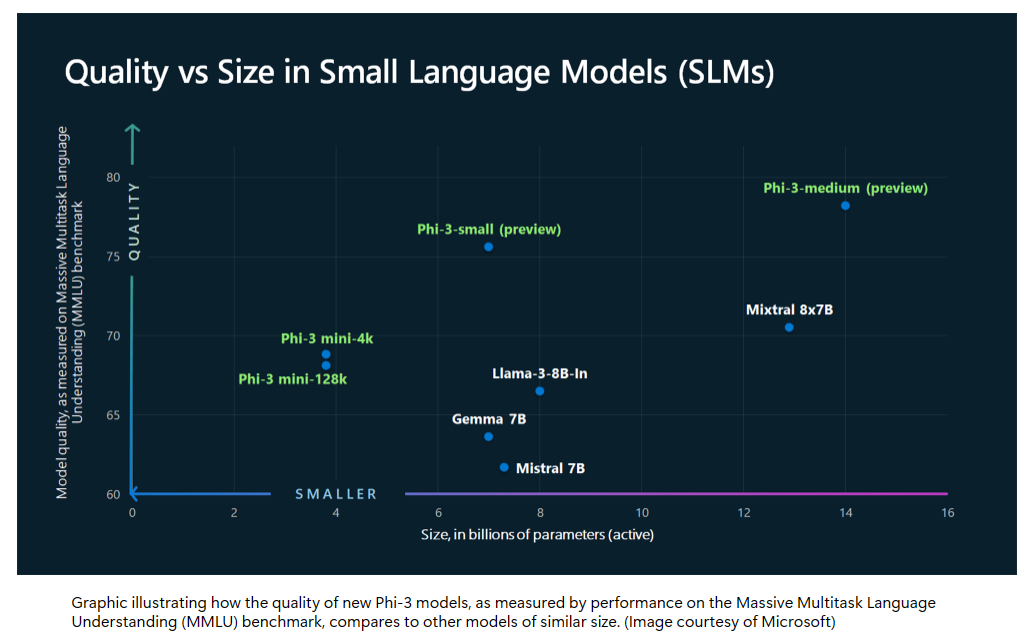 Per esempio, Phi-3 Medium conta circa 7 miliardi di parametri, ma è circa il 15% più efficace di Mistral 7B, con 7 miliardi di parametri anch’esso rispetto al benchmark di riferimento.