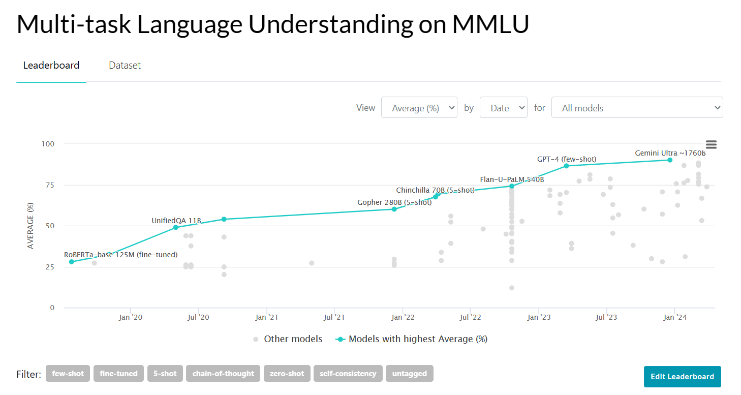 Per esempio Gemini Ultra, che conta un numero di parametri di oltre 170 miliardi a fronte dei solo 7 di Phi-3 Mini, con un vantaggio di soli 15 punti percentuali.