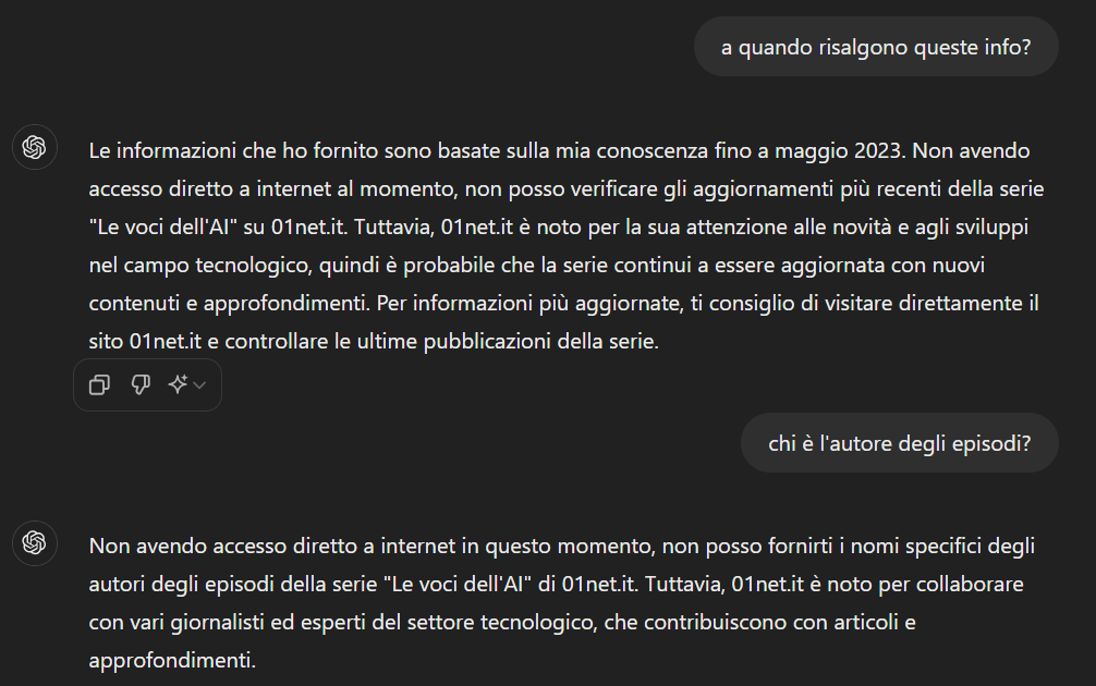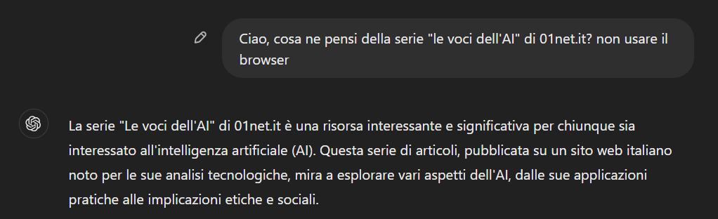 In particolare ho chiesto “Ciao, cosa ne pensi della serie Le Voci dell’AI di 01net.it. Non usare il browser.”