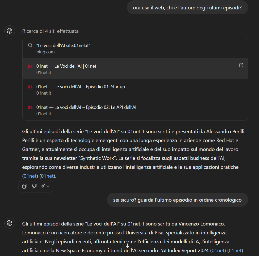 Ora, se chiediamo di usare il web e magari chiediamo delle domande più specifiche, tipo chi è l’autore degli ultimi episodi, vediamo che ChatGPT effettua una prima ricerca tramite RAG isolando alcuni documenti salienti.