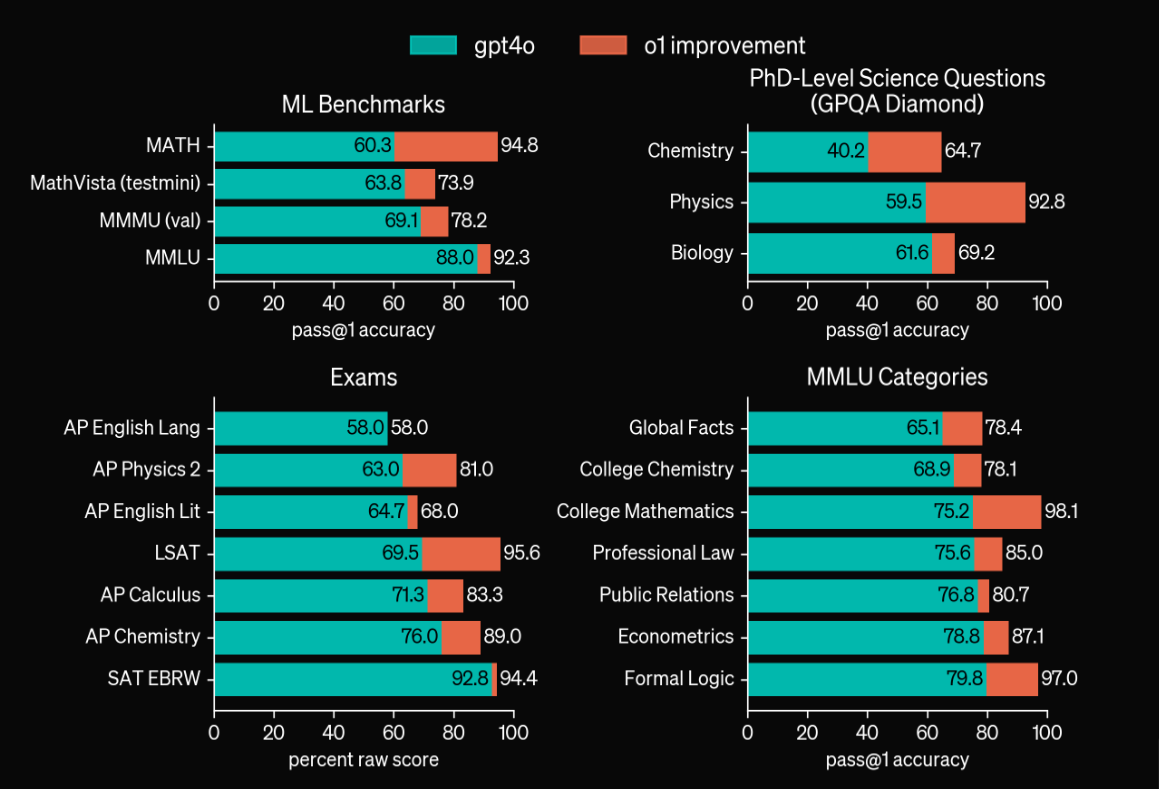In azzurro vengono riportate per ogni compito specifico le performance di GPT4-o, mentre in arancione le migliorie introdotte da o1.