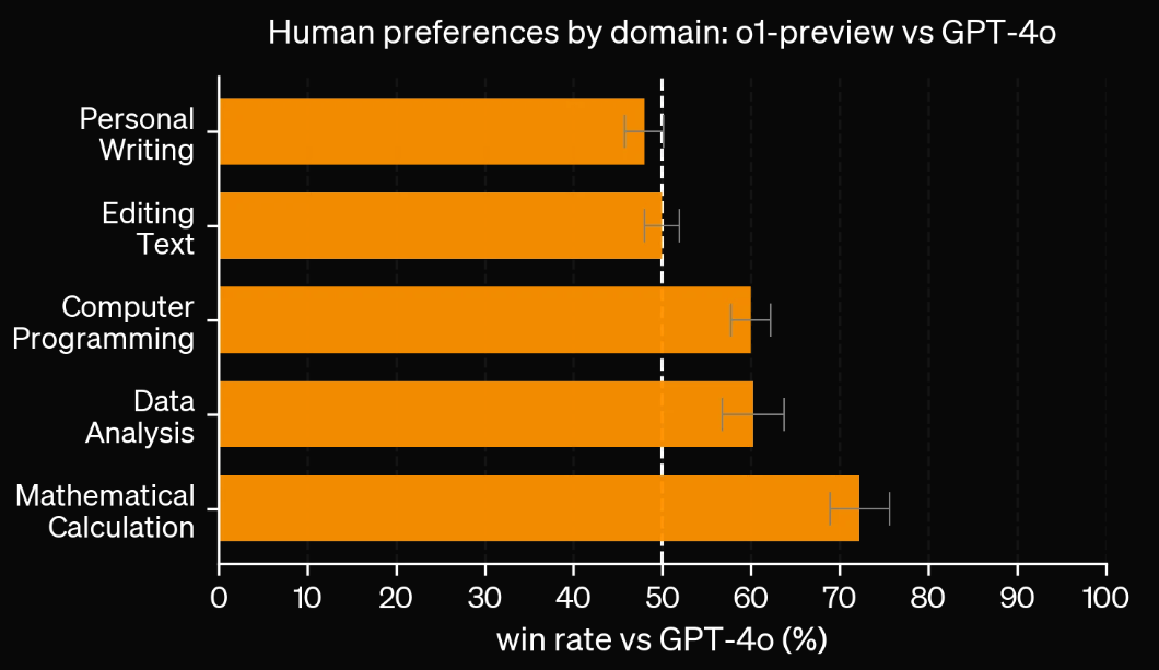 In questa immagine invece vediamo le preferenze di utenti che hanno avuto l’opportunità di usare o1e la percentuale di questi che preferisce usarlo rispetto a GPT-4o, però in funzione del compito che hanno da svolgere. Quindi sulle ordinate abbiamo il nome del compito, mentre sulle ascisse la percentuale di preferibilità di o1 rispetto a GPT-4o.