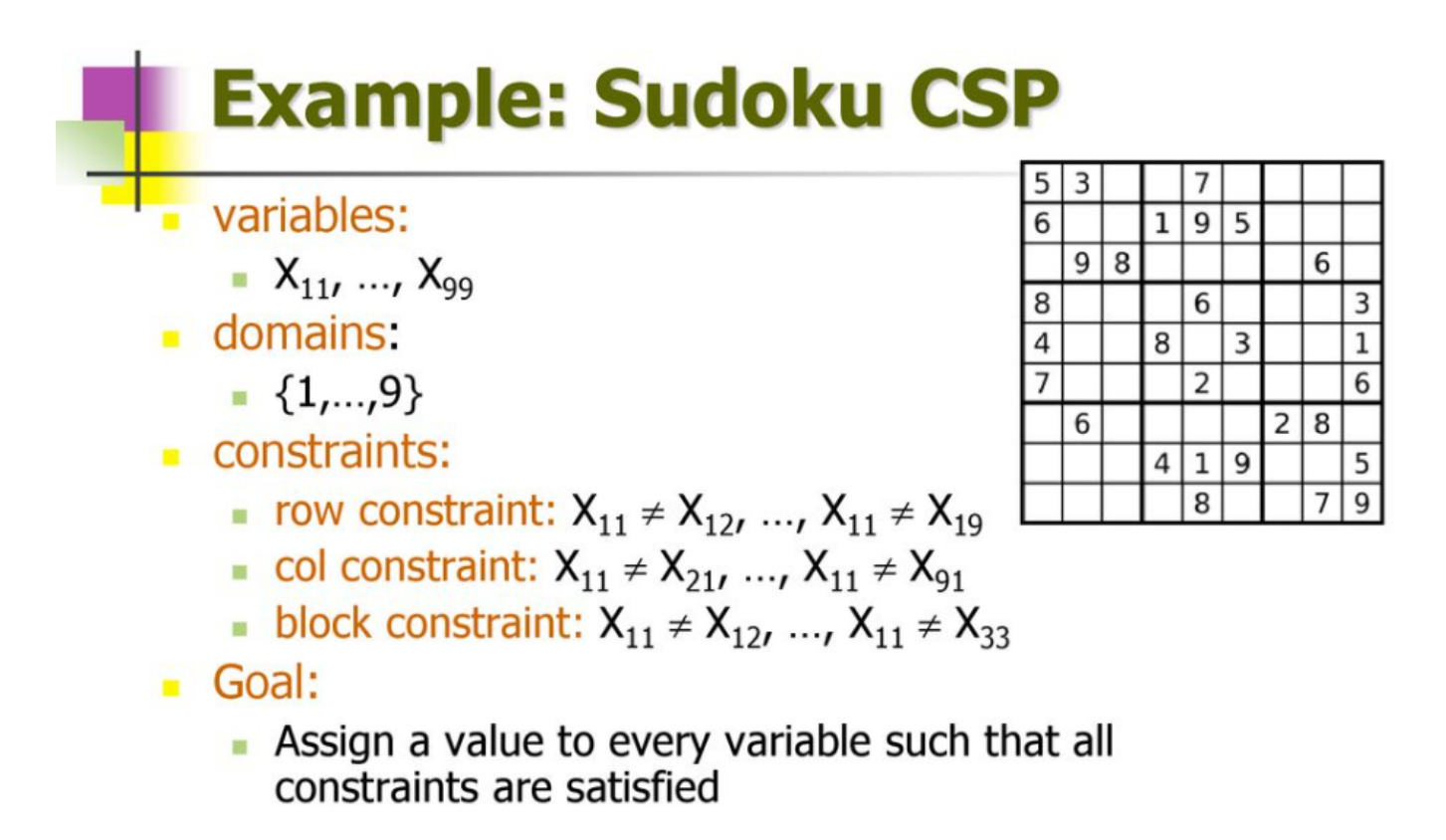 Invece potremmo descrivere il problema come un CSP, un constraint satisfaction problem costituito da variabili valori ammissibili per ogni variabile e vincoli tra le stesse.
