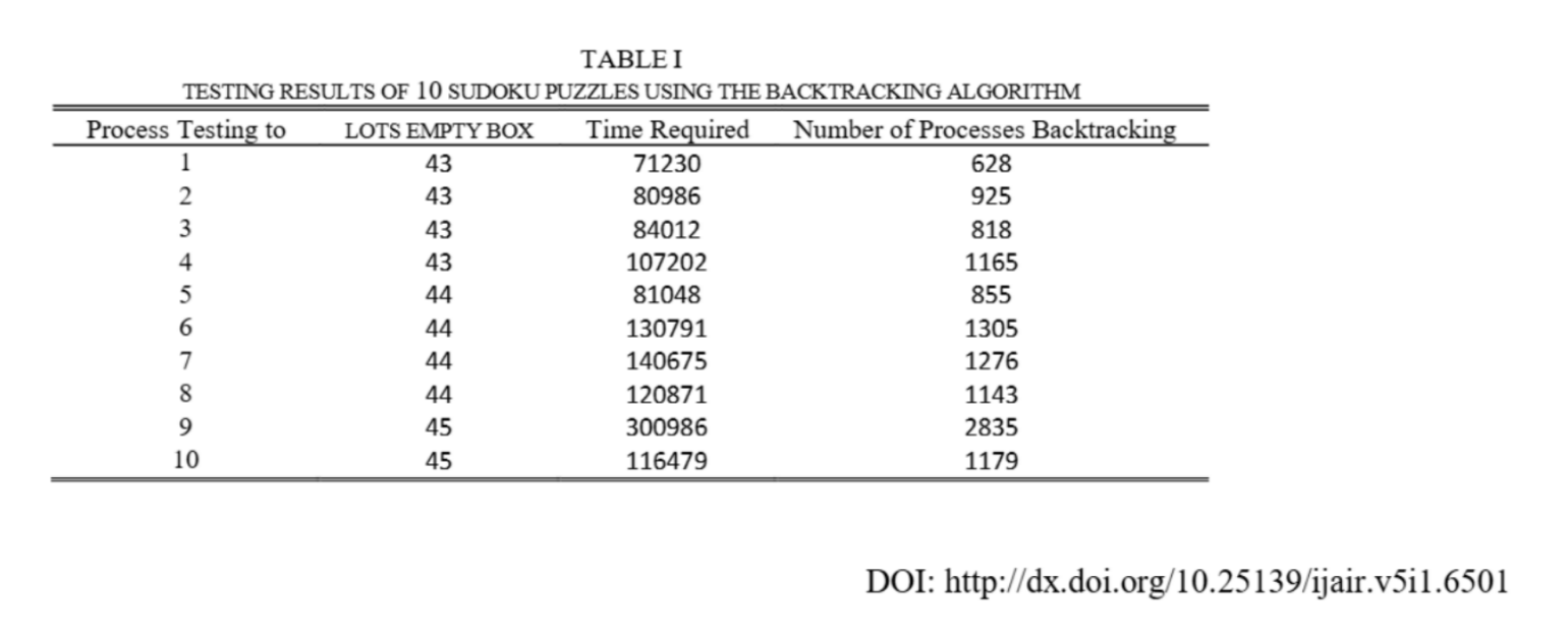 Iin questa tabella vediamo un’analisi empirica pubblicata in uno studio recente di un algoritmo classico di backtracking, l’algoritmo principale dei CSP solver in cui si testa lo stesso su dieci Sudoku puzzle di difficoltà crescente. Vedete nella seconda colonna il numero di caselle vuote che caratterizza anche la difficoltà del problema. Come vediamo sulla terza colonna, il tempo richiesto in millisecondi è davvero esiguo.