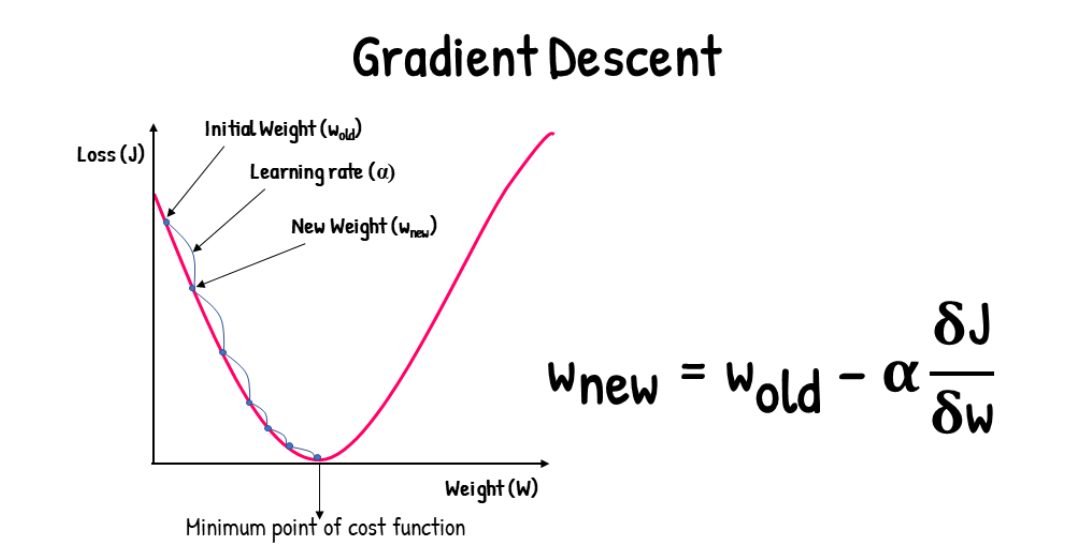 In questa immagine vediamo come, modificando un certo peso W sull’asse delle X è possibile minimizzare gli errori indicati sull’asse Y come funzione di perdita, di loss in modo incrementale iterativo, partendo un certo peso w-old e modificandolo gradualmente fino a portare a zero gli errori, se possibile.