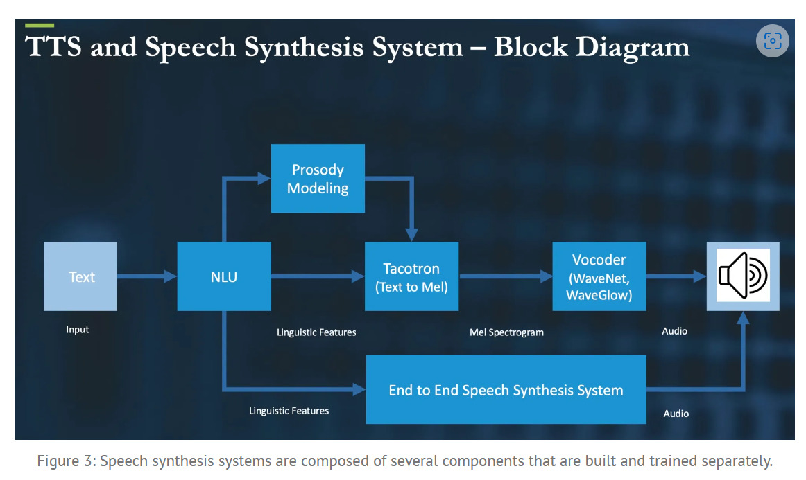 In questa immagine vediamo un diagramma di funzionamento ad alto livello delle soluzioni più recenti basate su machine learning per la sintesi vocale.