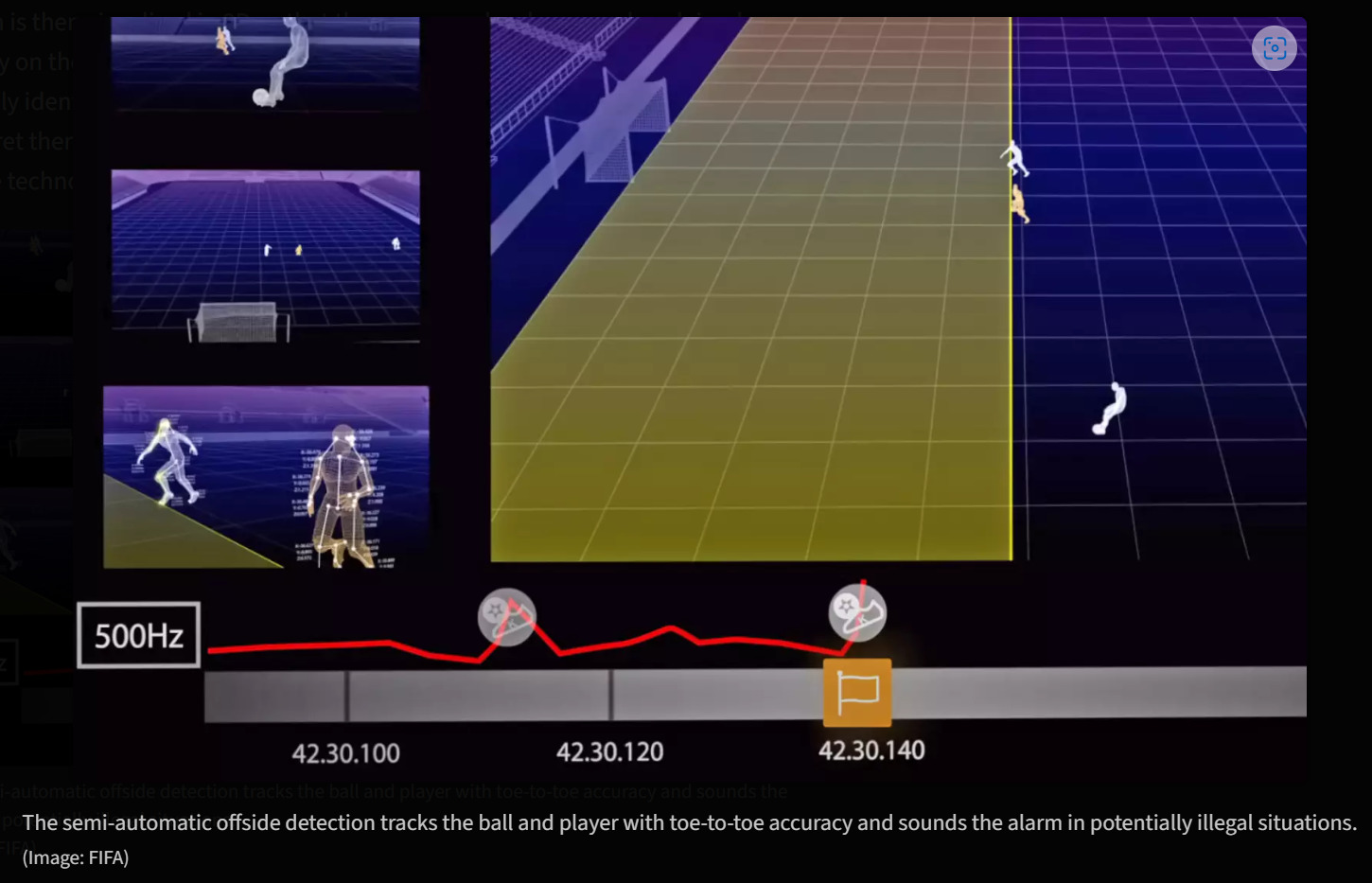 Il fuorigioco semiautomatico è stato introdotto negli ultimi mondiali in Qatar e serve per automatizzare il rilevamento del fuorigioco, una dinamica particolare del gioco del calcio tramite l’AI.