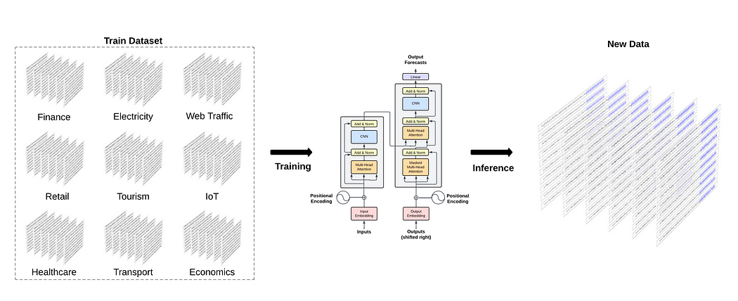 In questa immagine vediamo come TimeGPT venga addestrato e usato per fare previsioni sulle serie temporali.
