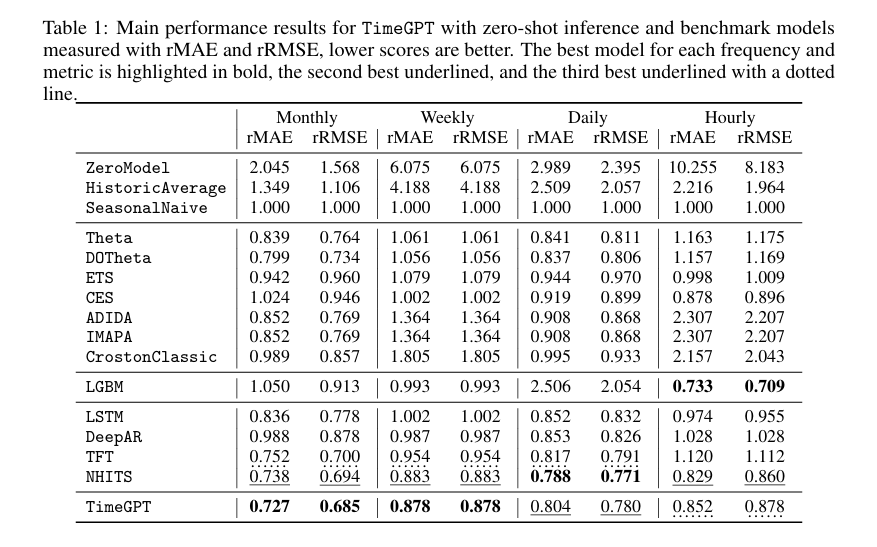 In particolare la tabella riassume i risultati delle prestazioni di TimeGPT rispetto a vari modelli di riferimento nella previsione delle serie temporali valutati secondo la rMAE ossia Relative Mean Absolute Error, dove valori più bassi indicano prestazioni migliori.