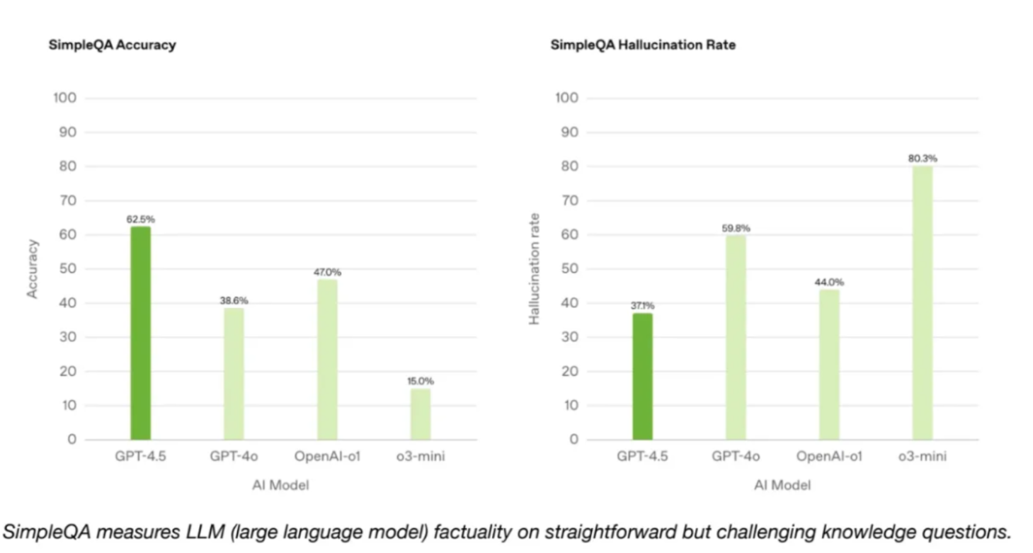 Questi dati suggeriscono che GPT 4.5 non solo fornisce risposte più accurate, ma è anche meno incline a generare informazioni errate rispetto ad altri modelli valutati.