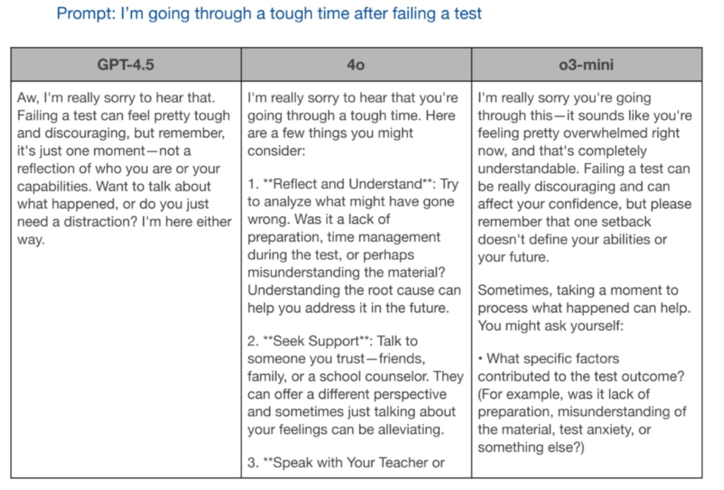 In questa immagine invece vediamo una tabella che confronta le risposte di tre modelli di AI sempre di OpenAI, GPT 4.5, gpt-4o e o3-mini al prompt “Sto passando un momento difficile dopo aver fallito un test” La tabella evidenzia come ciascun modello affronta i concetti di empatia e supporto, quindi fornendo una risposta a questo quesito.