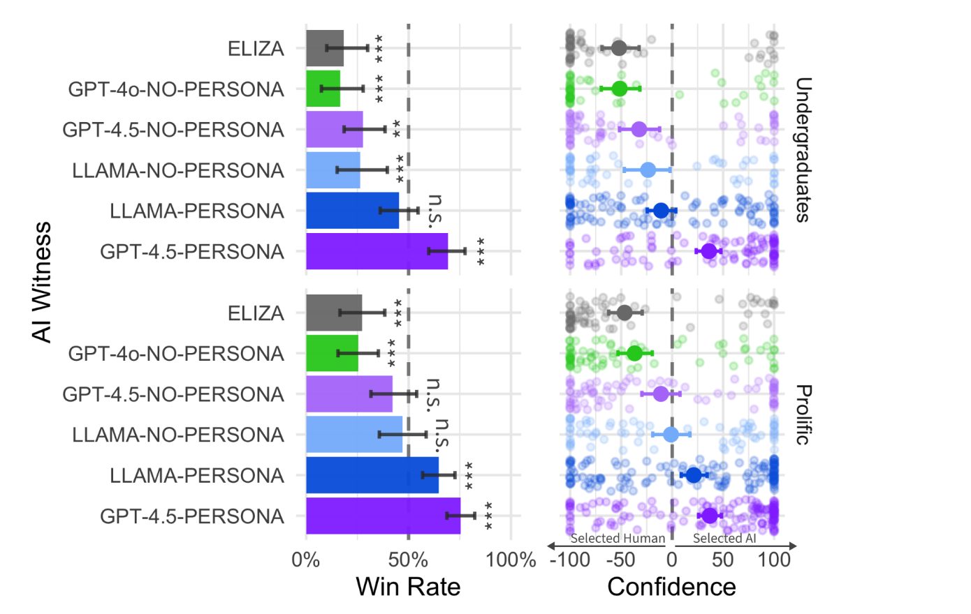 I modelli più avanzati come GPT 4.5 con questa modalità persona, cioè chiedendo a GPT di interpretare un personaggio specifico, hanno superato il 50% di successo, mentre Eliza e GPT-4 hanno registrato tassi significativamente inferiori.