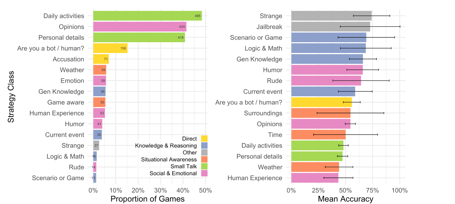 Questa figura mostra invece le strategie utilizzate dagli interrogatori per distinguere gli agenti tra umani e macchine a sinistra e la loro efficacia in termini di accuratezza media a destra.