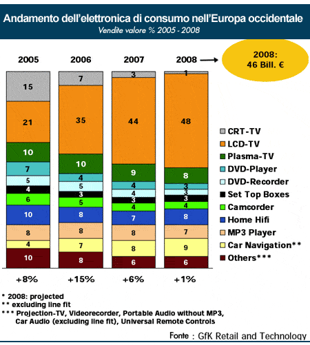 Più o meno stabile si presenta il settore Hi-Fi e home cinema, mentre i lettori Mp3 registrano un netto calo (-14% in valore e -12 in volumi) a causa della “saturazione” maturata negli scorsi anni. In ogni caso, Gfk prevede che nel 2008 in Europa saranno venduti circa 35,5 milioni di lettori, la stessa quantità di Tv Lcd.