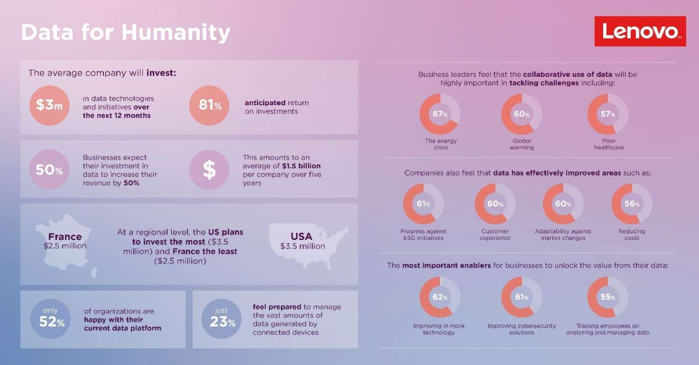 Dallo studio – mette in evidenza Lenovo – emerge che i dati sono da considerare come una soluzione per aiutare le aziende ad affrontare le sfide del pianeta migliorando al contempo la stabilità finanziaria, con un quarto (26%) degli intervistati che dichiara di voler fare di più con i propri dati per il beneficio dell’umanità.