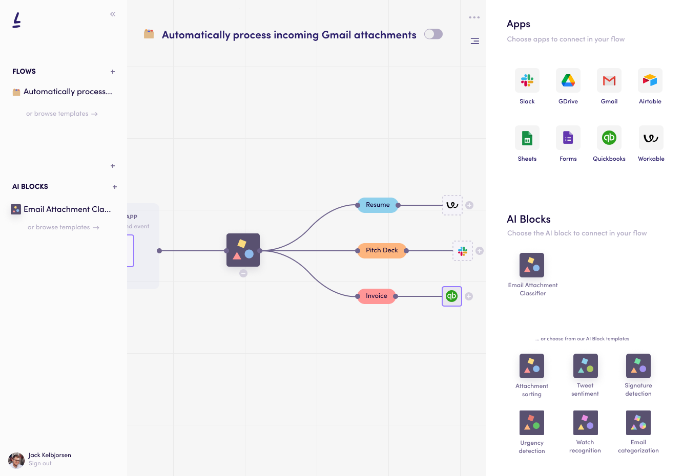 L’interfaccia utente consente di iniziare con la piattaforma in maniera rapida. Per definire un workflow ci si connette a una fonte di dati, si sceglie un AI Block e si stabiliscono le azioni da intraprendere. Poi, si caricano i dati di training per alimentare il proprio modello personalizzato con alcuni dati iniziali.