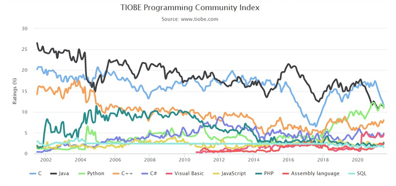 I primi tre linguaggi di programmazione del primo Tiobe Index erano Java, C e C++. Oggi, sottolinea l’azienda, la situazione sembra essere sorprendentemente simile.