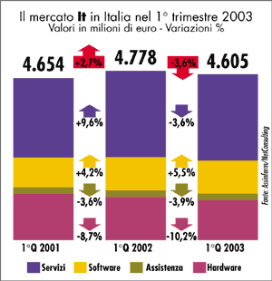 Il primo trimestre del 2003 presenta ancora dati poco confortanti. Nel complesso il mercato dell’Ict è sceso a un -0,2%, pari a 14,125 miliardi di euro, di cui 9,52 dovuti al settore delle Tlc, che peraltro sono cresciute dell’1,6%, mentre l’It, pari a 4,605 miliardi di euro, è scesa a un -3,6%. Quest’ultimo settore è stato, infatti, pesantemente penalizzato dall’hardware, che ha registrato un -10,2%, e dalla componente dei servizi, che ha accusato un -3,6%.