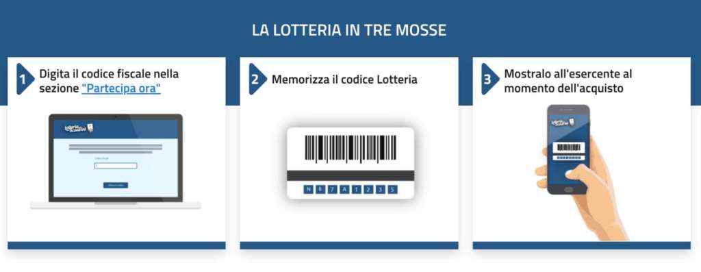 Il partecipante deve registrare il proprio codice fiscale sul sito della lotteria degli scontrini ottenendo in cambio un codice personale che dovrà comunicare all’esercente a ogni acquisto con cui intende partecipare alla lotteria.