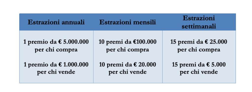 Per ogni estrazione sono previsti premi sia per l’acquirente sia per l’esercente presso cui è avvenuto l’acquisto.
