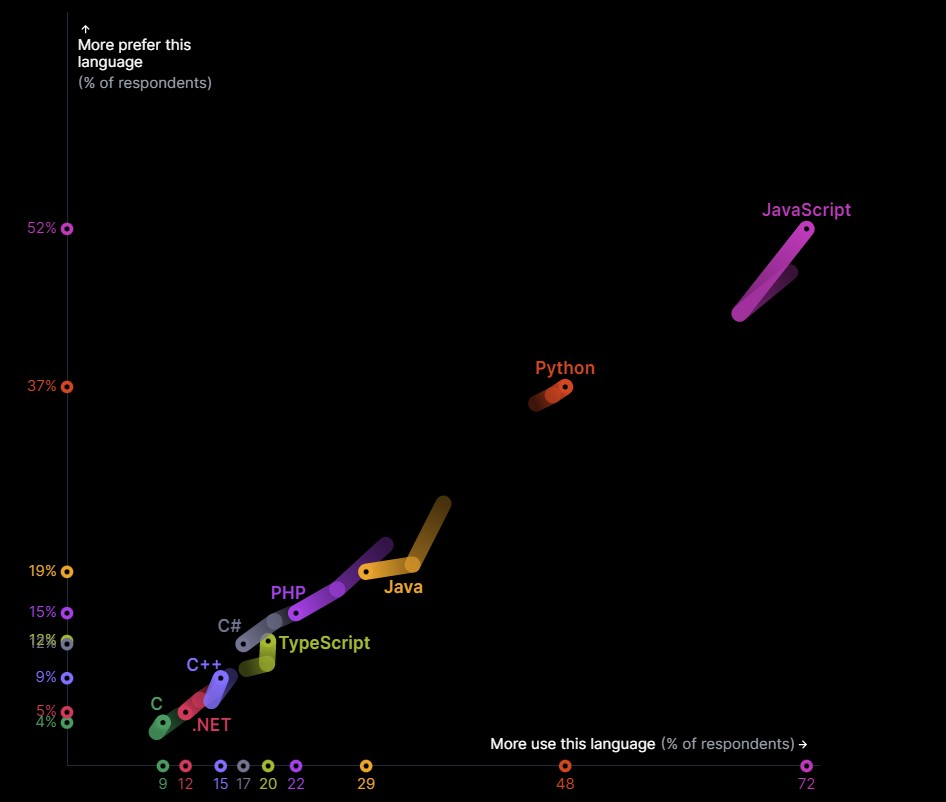 Benché JavaScript continui a dominare come il linguaggio di programmazione più usato (71,6%) e preferito (51,9%), per la prima volta TypeScript è entrato sia nella top five dei più usati (19,5%) che in quella dei più preferiti (12,1%).