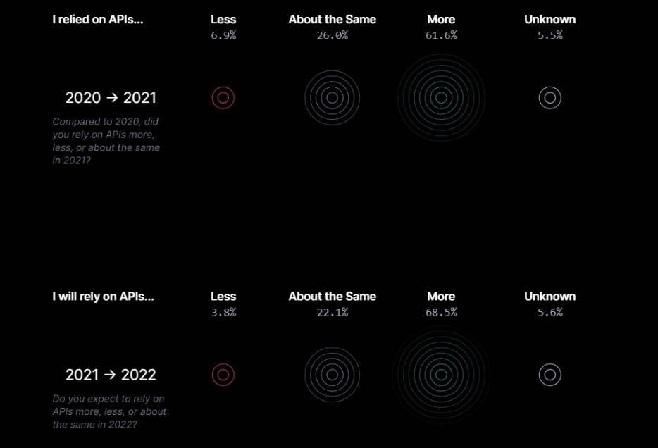 L’utilizzo delle API continua a salire, con oltre il 61,6% degli sviluppatori che si affidano alle API nel 2021 di più che nel 2020, e il 68,4% che prevede di utilizzare ancora più le API nel 2022 rispetto al 2021.