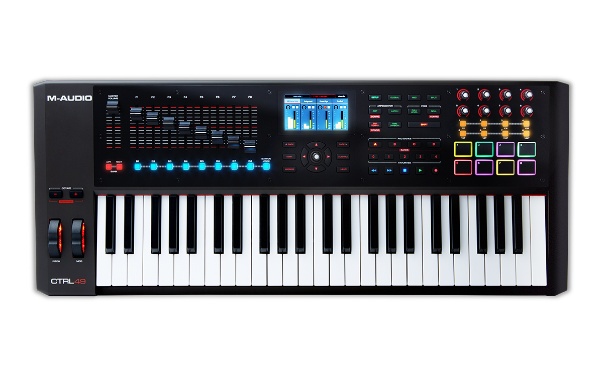 La nuova M-Audio CTRL49 è una keyboard controller MIDI USB fornita di un ricco arsenale di controlli per VST e DAW. La tastiera dispone di 49 tasti semi-pesati dotati di aftertouch; sono presenti le wheel per pitch e modulation. La dotazione di controlli è ricca e diversificata: otto pad percussivi con illuminazione RGB, sensibili alla pressione e alla velocity; nove fader e otto pulsanti per il controllo della DAW; otto manopole a 360 gradi.