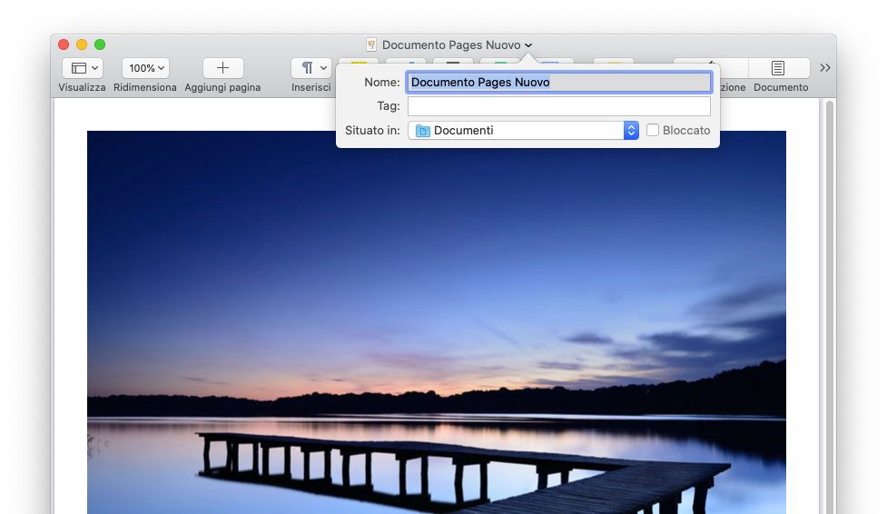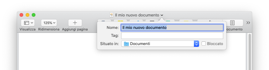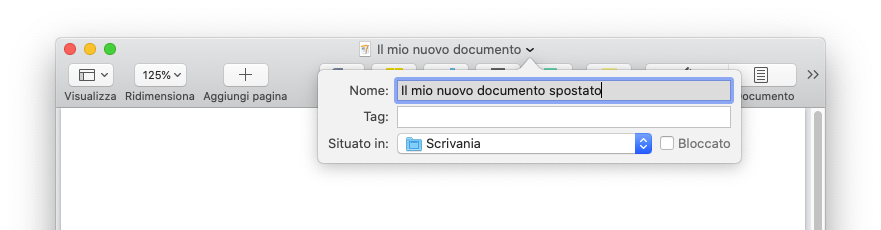 Fai clic sulla barra del titolo (sul titolo, non sull’icona): l’applicazione mostra un pannello a comparsa. Qui puoi rinominare il documento o anche spostarlo (scegliendo un’altra posizione dal menu Situato in) senza dover abbandonare l’area di lavoro e spostarti nel Finder.