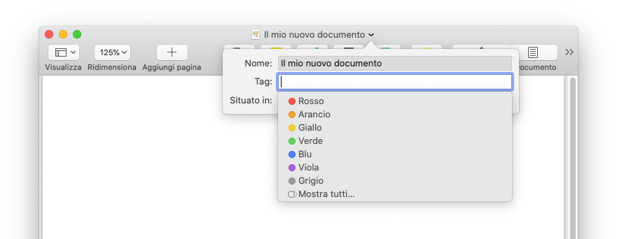 Direttamente dalla barra del titolo puoi anche assegnare un Tag al documento, una funzionalità a volte sottovalutata ma che può risultare molto utile per classificare (e successivamente filtrare e ritrovare con maggiore facilità) i file.