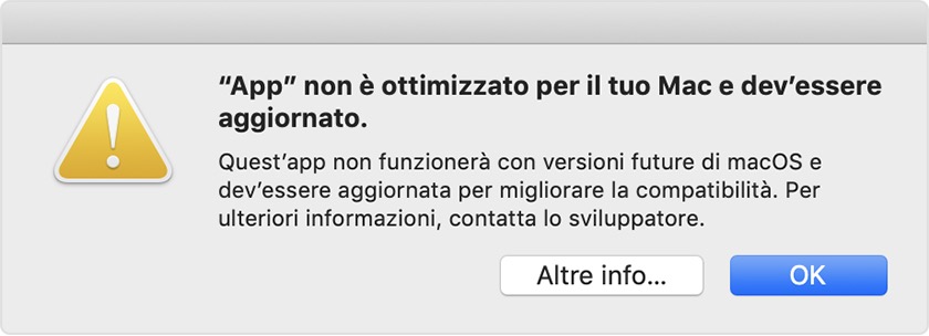 Come dicevamo, se apriamo un’app a 32 bit in macOS Mojave (o in una versione precedente che esegue la verifica), il Mac ci avvisa che “(Nome app)” non è ottimizzato per il tuo Mac e dev’essere aggiornato. Ci presenta inoltre il pulsante Altre info che porta alla nota tecnica sul sito di supporto Apple.