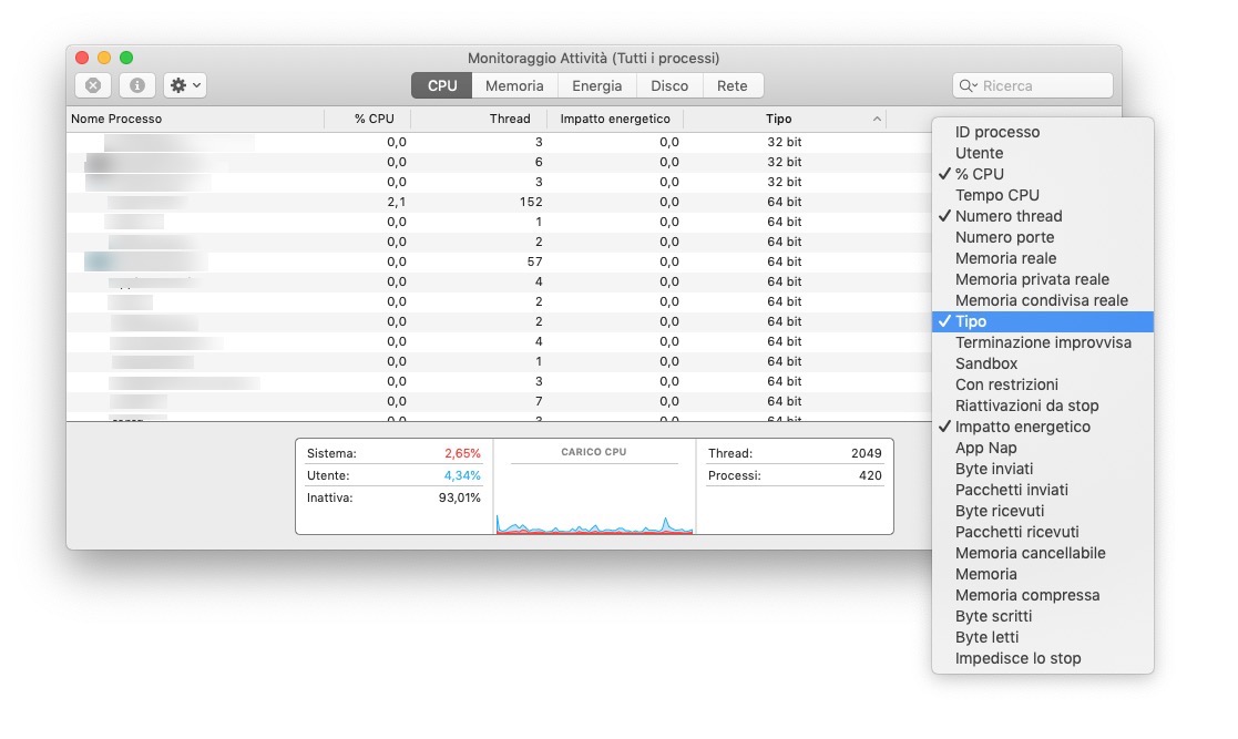 • La finestra di Monitoraggio Attività mostra i processi attivi: verifica che tra le colonne ci sia quella denominata ”Tipo”. Se non c’è, fai clic destro (o ctrl + clic) sull’intestazione delle colonne e seleziona la voce Tipo.