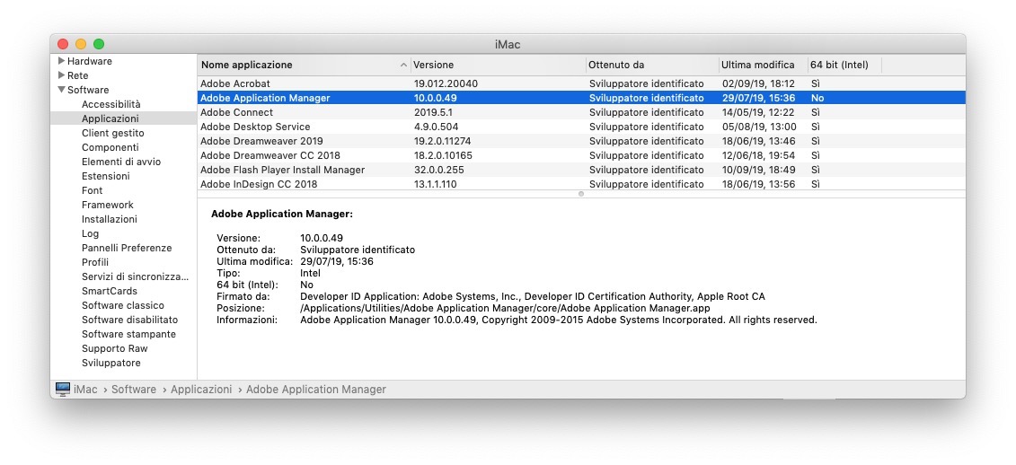 Facendo clic su un’applicazione, Informazioni di sistema mostra ulteriori dettagli sull’applicazione, tra cui, anche in questo caso, il campo 64 bit (Intel). È del tutto intuitivo: se questo campo (e la relativa colonna) riportano un , l’app è a 64 bit; un No invece ci mette in guardia sul fatto che si tratta di un’app a 32 bit.