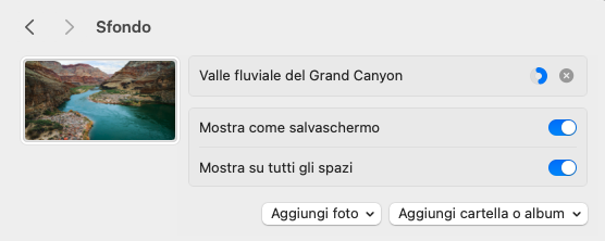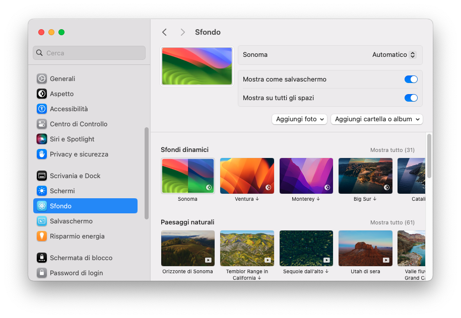 L’interruttore Mostra su tutti gli spazi indica a macOS Sonoma di utilizzare lo sfondo selezionato su tutti gli spazi della scrivania che abbiamo eventualmente impostato.