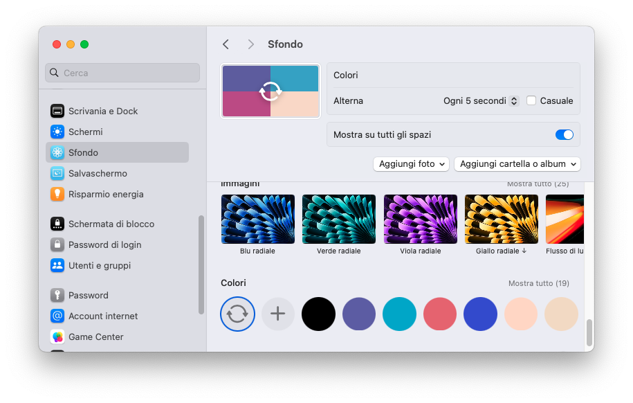 Se invece preferiamo uno sfondo sobrio ed essenziale, anche in questo caso macOS può venirci incontro. Infatti, come sfondo della scrivania possiamo anche scegliere semplicemente un colore pieno.