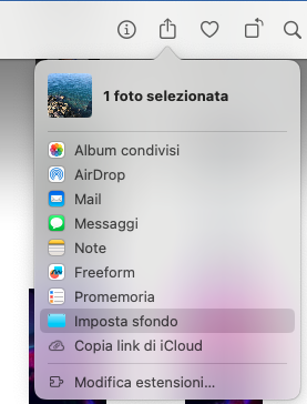 Oppure, dall’app Foto, selezioniamo un’immagine, facciamo clic sul pulsante Condividi e scegliamo il comando Imposta sfondo.