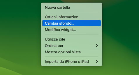Esiste una scorciatoia anche per accedere alle impostazioni dello sfondo della scrivania: facciamo clic su un’area vuota del desktop tenendo premuto il tasto ctrl, o clic con il pulsante destro del mouse, e selezioniamo Cambia sfondo dal menu contestuale.