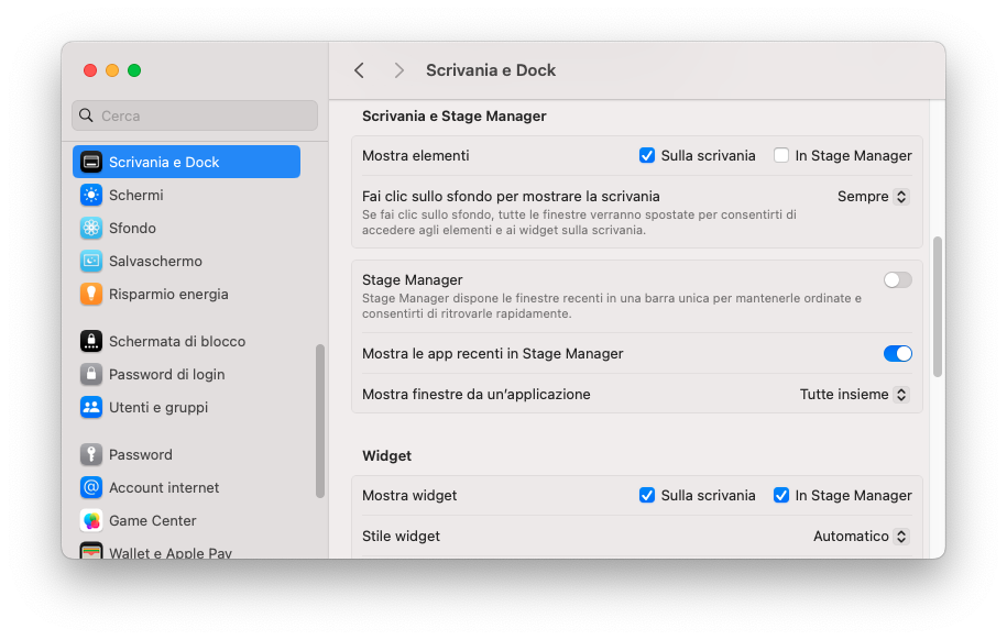 Nelle Impostazioni di Sistema, selezioniamo la scheda Scrivania e Dock: qui, nella sezione Scrivania e Stage Manager, è presente il controllo Fai clic sullo sfondo per mostrare la scrivania.