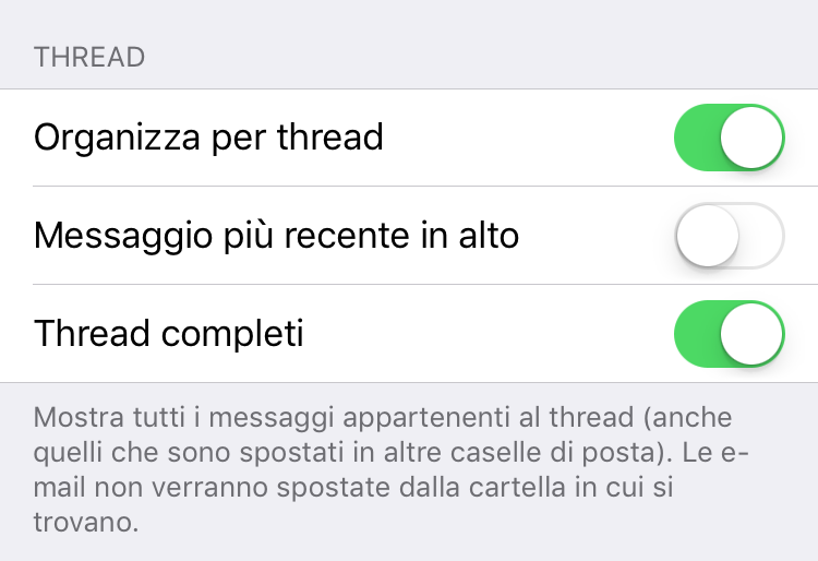 Possiamo anche disabilitare del tutto la visualizzazione per thread, che però è molto comoda. Tutti i comandi sono in Impostazioni > Mail.