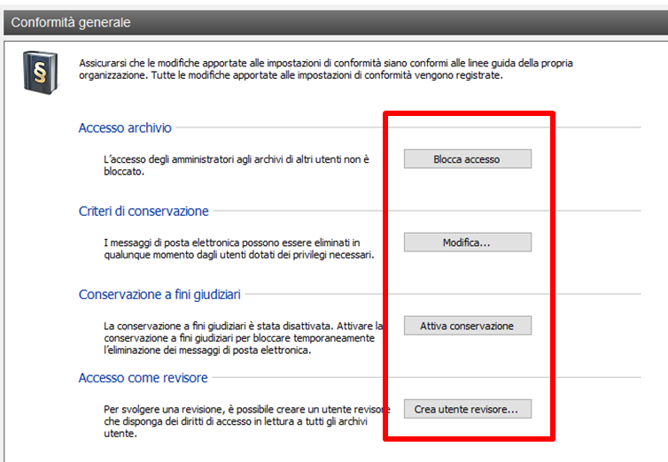 • Protezione relativa alla cancellazione e manipolazione delle email, con l’impostazione di conservazione delle informazioni (Art 32)